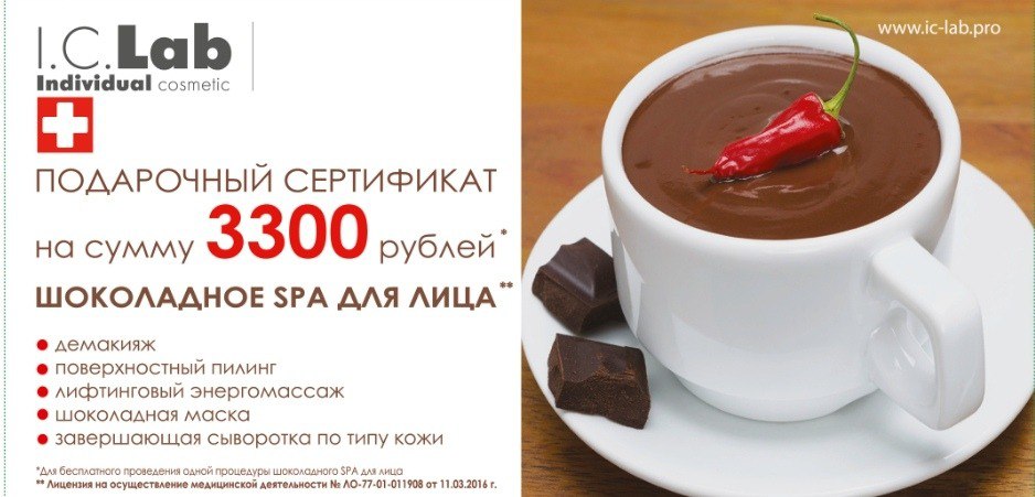На семейном фестивале «Спортлэнд» 31 октября и 01 ноября в ТВЦ «Гостиный двор» лаборатория Индивидуальной Косметики I.C.Lab сделает прекрасный подарок всем женщинам, мамам, бабушкам, которые посетят фестиваль в один из дней – СЕРТИФИКАТ НА СУММУ 3 300 руб. на процедуру «ШОКОЛАДНОЕ СПА для ЛИЦА»!